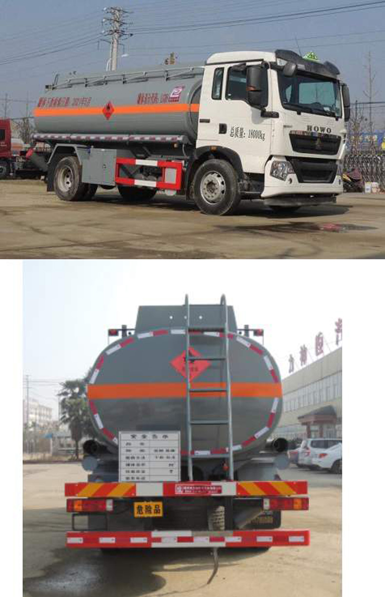 罐體有效容積:12立方米,危險(xiǎn)貨物運(yùn)輸車輛類型:FL型輛,介質(zhì)類項(xiàng)號(hào):3;加油裝置前置時(shí),罐體尺寸(長(zhǎng)×長(zhǎng)軸×短軸)(mm)為:4700×2160×1500;當(dāng)加油裝置下置時(shí),罐體尺寸(長(zhǎng)×長(zhǎng)軸×短軸)(mm)為:5700×2000×1350;軸距/前懸/后懸對(duì)應(yīng)關(guān)系為(mm):4700/1430/2570,5000/1430/2270;隨底盤選裝工具箱樣式,選裝擋泥板及加油倉(cāng)廂門和尾部不帶工具箱;側(cè)、后防護(hù)裝置材料材質(zhì):Q235B,側(cè)、后防護(hù)均用螺栓連接,后部防護(hù)裝置斷面尺寸(寬×高)80×150(mm),后部防護(hù)離地高度:500mm;安裝具有衛(wèi)星定位功能的行駛記錄儀,排氣管前置,安裝前輪盤式制動(dòng)器及限速裝置,限速80km/h,僅采用底盤子午線輪胎;ABS系統(tǒng)控制器生產(chǎn)企業(yè)/型號(hào)為威伯科(上海)管理有限公司/4460046300;選裝EBS,EBS系統(tǒng)控制器生產(chǎn)企業(yè)/型號(hào)為威伯科(上海)管理有限公司/EBS3;加油裝置型號(hào)/生產(chǎn)企業(yè):CS20D1110F/正星科技有限公司,80YHCB-60/山東博山齊魯油泵廠,YHCB-1000/5-A,YHCB-1000/5B,YHCB-300/3-B-L/永嘉三江石油機(jī)械廠. 該車后軸為采用空氣懸架.