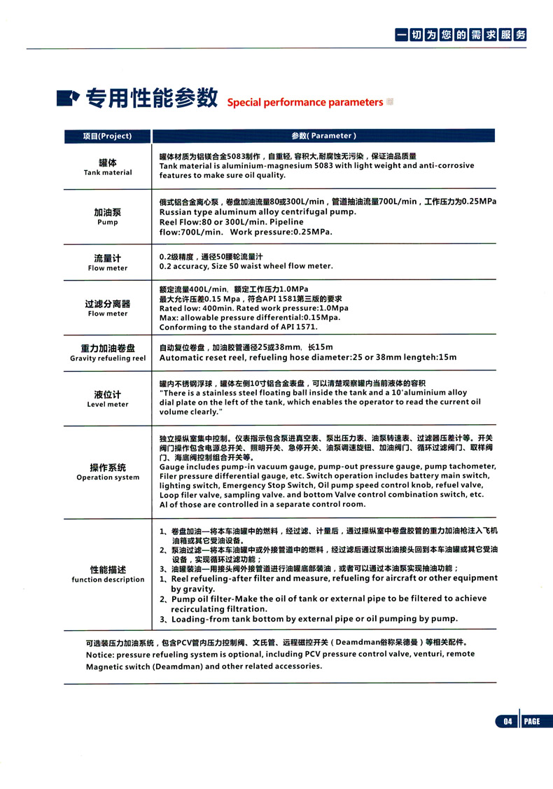 罐體有效容積:8.13立方米,危險貨物運輸車輛的類型為FL型,介質:航空汽油,航空煤油;類項號:3;加油裝置上置時,罐體尺寸(長×長軸×短軸)(mm)為:3800×1950×1400;加油裝置下置時,罐體尺寸(長×長軸×短軸)(mm)為:4700×1750×1250;僅采用3900mm軸距;隨底盤選裝駕駛室,選裝加油裝置下置,選裝箱門樣式;側、后防護裝置材料材質:Q235B,側、后防護均采用螺栓連接,后防護裝置斷面尺寸為(mm):80×150,后部防護離地高度:450mm;安裝具有衛星定位功能的行駛記錄儀;安裝排氣管前置,前盤制動,限速裝置,限速80km/h,僅采用底盤子午線輪胎;ABS生產廠家/型號:1.廣州瑞立科密汽車電子股份有限公司/CM4XL-4S/4M;2.浙江萬安科技股份有限公司/VIE ABS-II.轉向輪安裝爆胎應急防護裝置.