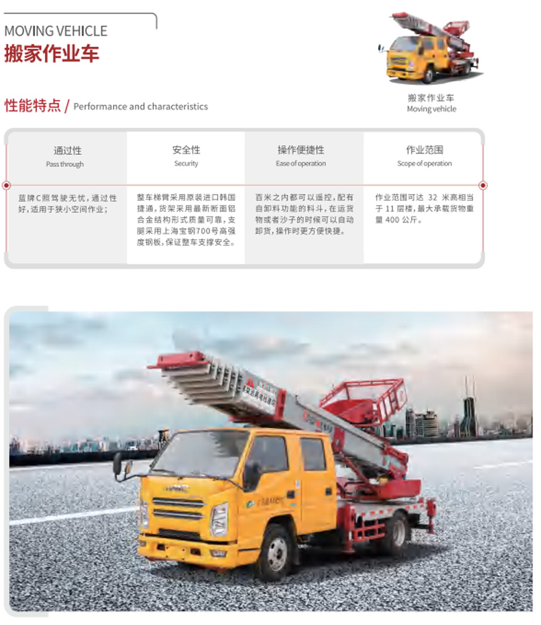 高空作業車價格_高空作業車廠家_楚勝集團★13908669111★江鈴30米搬家作業車產品名稱:楚勝牌CSC5041TBA6J30型搬家作業車,采用江鈴JX1041TSG26底盤改裝而成,該車專用裝置為云梯梯臂,主要用于搬家作業。作業范圍可達32米高相當于11層樓,最大承載貨物重量400公斤。本公司專業生產銷售各類伸縮臂高空作業車,折疊臂高空作業車,液壓升降車,搬家云梯車,外形美觀,操作方便,節省燃油。更多高空作業車盡在:www.4fj.com.cn