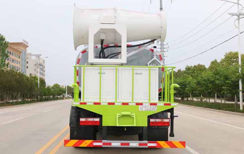 消防灑水車安裝消防車專用消防泵、消防炮、消防取力器。罐體后帶工作平臺,平臺上安裝綠化灑水炮,灑水炮可全方位旋轉,帶前沖后灑,帶側噴,可連續調成直流狀、霧狀、大雨、小雨、毛毛雨,帶安全護欄。罐體頂部安裝消防水炮。帶消防接口,可通過消防栓進水,帶自流閥,消防綠化卷盤。