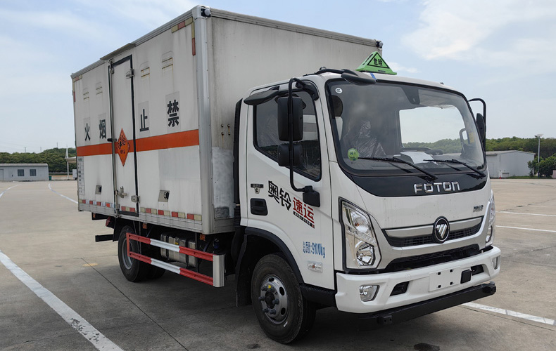 該車適用于運輸危險品.運輸具有獨立容器(瓶)包裝的物品,危險貨物運輸車輛類型EX/III.類項號:1.1B,1.1C,1.1D,1.1G,1.2C,1.2D,1.2G,1.3C,1.3G,1.4C,1.4D,1.4G.廂體頂部封閉,不可開啟.側、后防護材料均為Q235,螺栓連接,后防護截面尺寸(mm)100×50,下邊緣離地高430mm.僅選用排氣管前置、限速裝置(限速80km/h)、前輪盤式制動及子午線輪胎的底盤;轉向輪裝備輪胎爆胎應急防護裝置.安裝帶有衛星定位功能的行駛記錄儀.ABS型號:ABS-VI.E;生產企業:廣州瑞立科密汽車電子股份有限公司.ABS系統型號:ABS-E;生產企業:威伯科汽車控制系統(中國)有限公司.發動機/油耗值(L/100Km)對應關系為:F3.8NS6B156/17.09,D30TCIF1/16.19,Q28-130E60/17.34,F2.8NS6B156/17.61,F2.8NS6B150/17.61,Q28-152E60/16.67,F2.5NS6B160/17.18.整車外形尺寸長/前后懸對應關系為(mm):6230/1110/1760,6230/1130/1740,6230/1140/1730,6130/1110/1660,6130/1130/1640,6130/1140/1630,5995/1110/1525,5995/1130/1505,5995/1140/1495.選裝直接供電式ETC車載裝置.隨底盤選裝新前圍及前部燈具.選裝LOGO標識.選裝后門雙拉桿.廂體側面選裝不同型式側開門及開門位置或不帶側門,選裝開百葉窗,選裝后門結構.