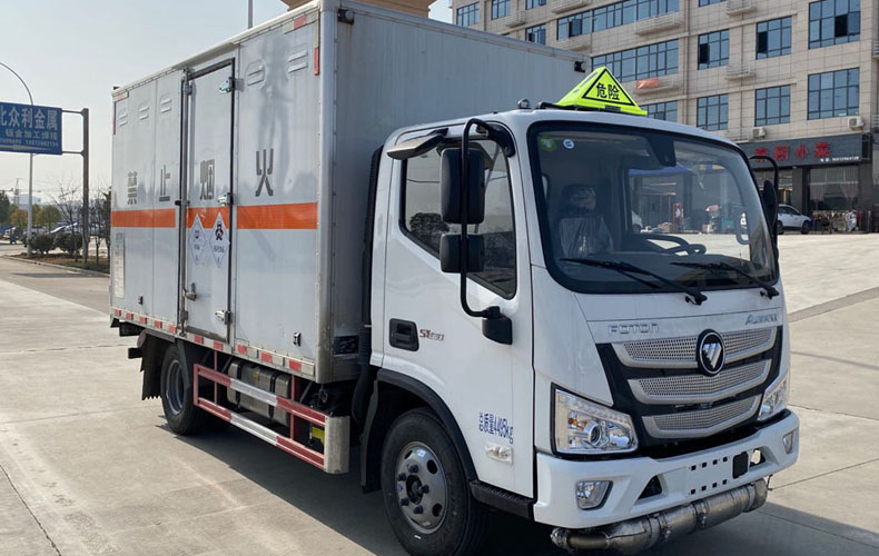 該車為危險品運輸車,運輸具有獨立容器(瓶)包裝的物品,運送危險物品類項號:6.1,6.2。廂體頂部封閉,不可開啟。側后防護材料均為Q235,螺栓連接,后防護截面尺寸(mm)100×50,下邊緣離地高450mm。廂體選裝側開門及位置或無側門、選裝后門雙拉桿、選裝制冷機組,廂體選裝瓦楞板結構,選裝百葉窗。僅選用排氣管前置、限速裝置(限速80km/h)、前輪盤式制動及子午線輪胎的底盤;轉向輪裝備輪胎爆胎應急防護裝置。安裝帶有衛星定位功能的行駛記錄儀。ABS型號/生產廠家:ABS-E/威伯科汽車控制系統(中國)有限公司,ABS-VI·E/廣州瑞立科密汽車電子股份有限公司,YF8/武漢元豐汽車電控系統有限公司。發動機/油耗值(L/100Km)對應關系為: D25TCIF1/11.16,F2.5NS6B131/11.27。選裝ETC。選裝后尾板時,后防護材料為Q235,螺栓連接,截面尺寸φ100mm,下邊緣離地高450mm。尾板收起狀態水平長度為280mm,尾板質量為350kg。隨底盤選裝駕駛室,選裝排氣管后處理、電瓶、儲氣筒安裝位置。整備質量包括備胎,滅火器,停車楔,隨車工具。貨廂重量(kg):590,500;材質/厚度:底板,碳鋼/3mm;側板,內板鋁板/1mm,外板碳鋼/1.2mm,夾層聚氨酯阻燃泡沫/40mm。選裝儲氣筒樣式。隨底盤選裝前臉標識.
