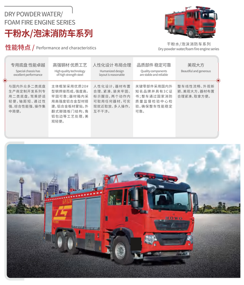 干粉泡沫聯(lián)用消防車具有滅火效率高、射程遠(yuǎn)、性能強(qiáng)的特點(diǎn),配置多種滅火劑,可撲救可燃?xì)怏w、易燃液體、有機(jī)溶劑和電氣設(shè)備以及一般物質(zhì)類火災(zāi),是應(yīng)急消防隊(duì)、石油、化工、電力等企業(yè)常備的主戰(zhàn)消防車。