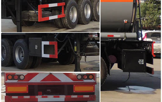 罐體有效容積:22.4立方米,危險(xiǎn)貨物運(yùn)輸車輛類型為AT型,介質(zhì)最大密度1430(kg/ m3);罐體尺寸(含保溫層厚80毫米):長10360毫米,直徑(前/后)1760/1910毫米;該車型選裝擋泥板,選裝箱門樣式,選裝罐體頂部走臺;EBS生產(chǎn)廠家/型號:威伯科汽車控制系統(tǒng)(中國)有限公司/4801020640;ABS生產(chǎn)廠家/型號:克諾爾商用車系統(tǒng)企業(yè)管理(上海)有限公司/K068353XXX;防護(hù)材料均采用Q235,側(cè)防護(hù)用螺栓連接,后防護(hù)用焊接連接,后部防護(hù)裝置斷面尺寸(寬×高)80×150(mm),后部防護(hù)離地高度:500mm;采用適用于牽引危險(xiǎn)品運(yùn)輸半掛車的牽引車.