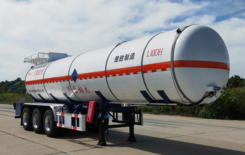 該車適用于危險品運輸,運送危險貨物車輛類型為:FL型.運輸介質為:三氯硅烷,類項號4.3.罐體有效容積:26立方米,單位容積充裝量:1258千克/立方米,罐體外形尺寸為(長×外徑)(mm):10597×Φ1805,保溫層厚度為50mm,保溫后罐體外形尺寸為(長×外徑)(mm)10697×Φ1905.側、后防護材料均為Q235,側防護螺栓連接,后防護焊接,后防護截面尺寸(mm):60×120,下邊緣離地高度470mm.該車采用空氣懸掛.EBS型號/生產企業:CM-TEBS/廣州瑞立科密汽車電子股份有限公司.采用適用于牽引危險品運輸半掛車的牽引車.選裝頂部護欄樣式,選裝爬梯樣式,左側選裝工具箱.